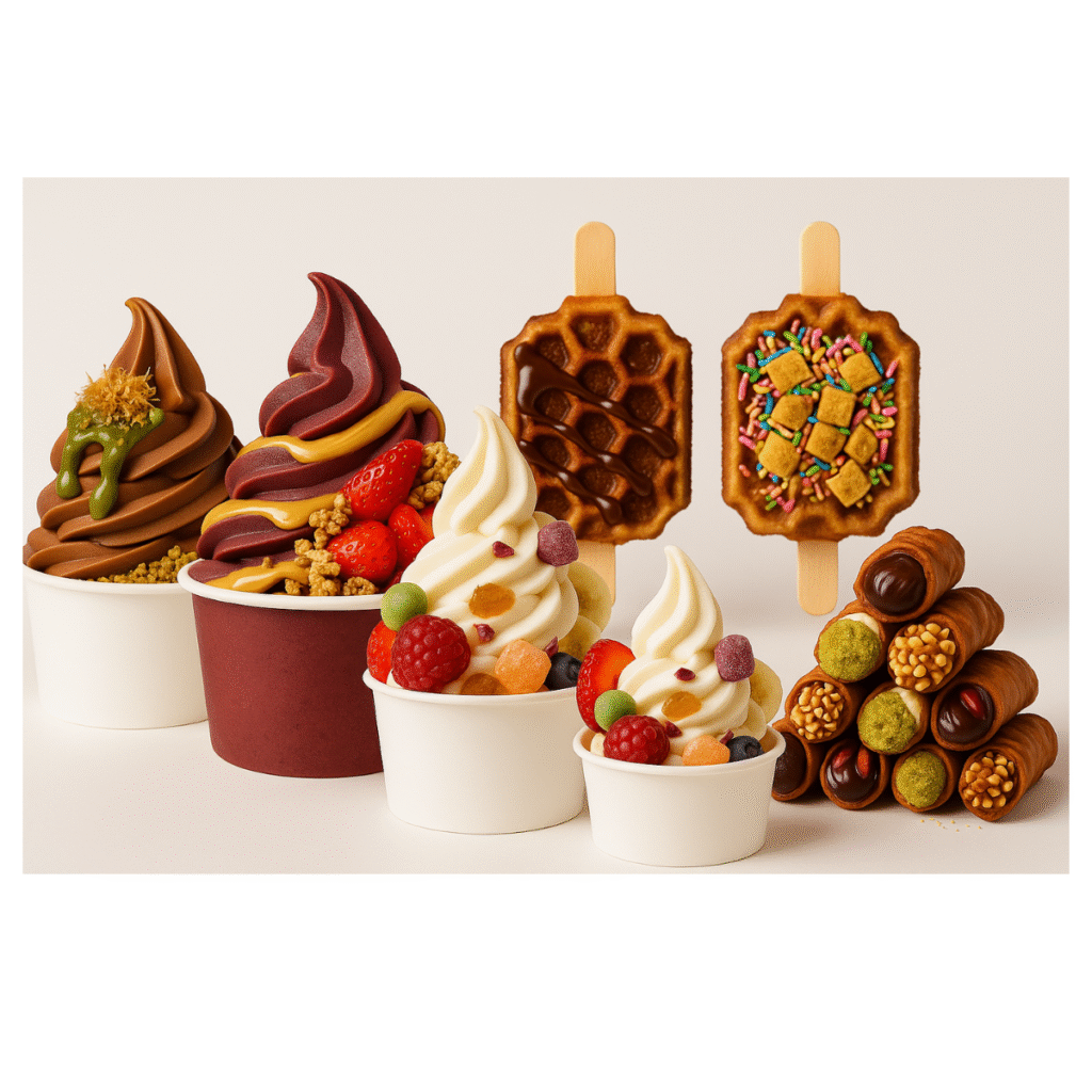 Smooth, swirled soft serve available in classic vanilla, chocolate, or a featured seasonal flavour. Premium flavour options are available to suit your party theme.
